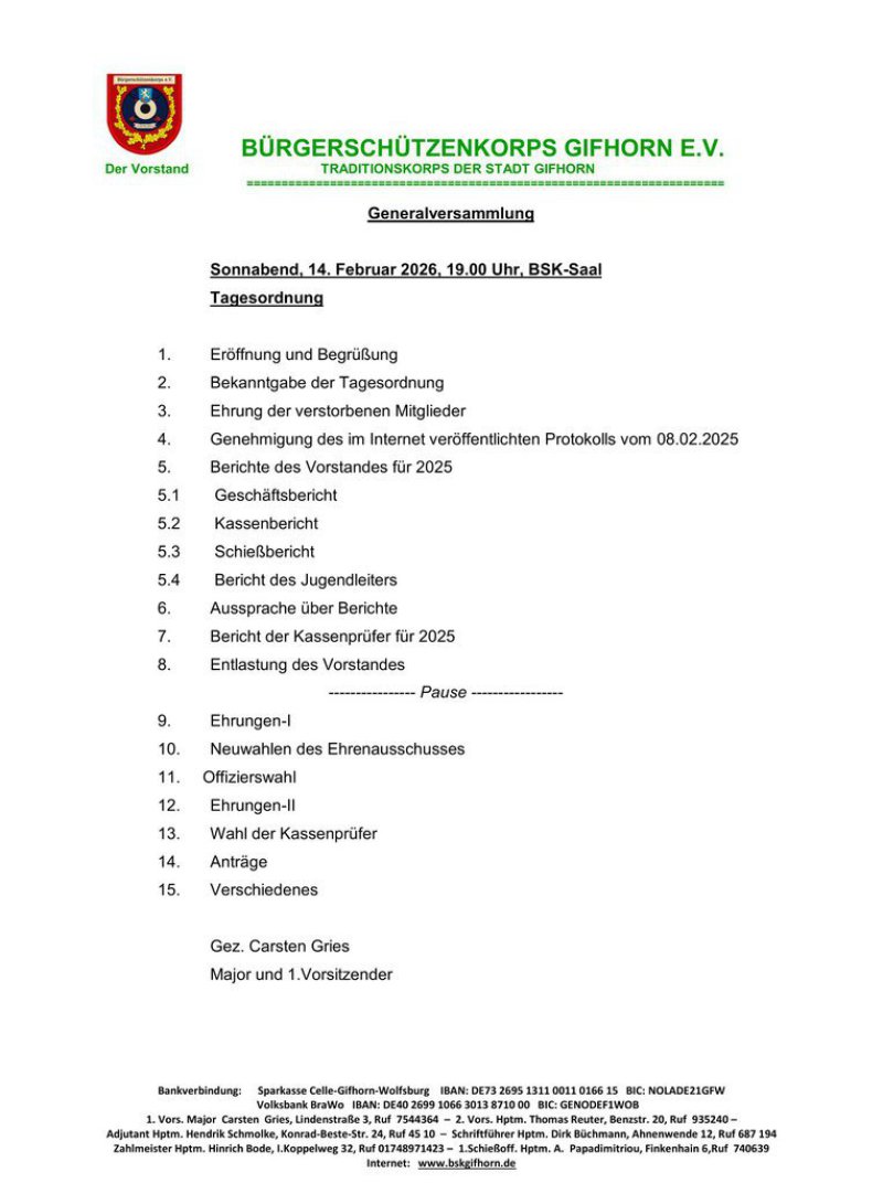 Am Samstag, den 14. Februar 2026 findet unsere Generalversammlung statt. Los geht es um 19:00 Uhr im Bürgerschützensaal. Die Tagesordnung findet ihr unter: Generalversammlung 2026